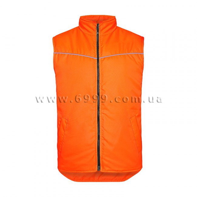 Жилет утеплений "Новатор" прямого, подовженого силуету, з застібкою на роз'ємну блискавку та коміром типу "стійка". Спинка та поличка мають кокетку, на яку нашито світловідбивний кант. Спинка має виступ з закругленими краями, внизу жилета. З обох боків, розташовані врізні кишені навскіс, внутрішня частина яких виготовлена з флісу. Модель "унісекс".