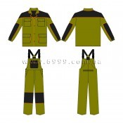 Напівкомбінезон робочий має на нагруднику прямокутну кишеню типу "книжка", з клапаном на текстильній стрічці, та дві бокові нижні кишені, з входом на вкіс. Довжину шлейок можна регулювати, за допомогою карабінів типу "фастекс" та рамок. З обох боків напівкомбінезон застібається на два ґудзики. А гульфік застібається на блискавку. У області талії, по спині, вшита внутрішня еластична стрічка. На колінах напівкомбінезон посилено наколінниками. Усі кишені типу "книжка"(прямокутні, об'ємні) мають бокові частини помаранчевого кольору.