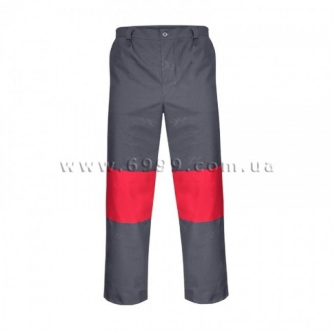Штани прямого силуету з наколінниками та двома накладними кишенями. Пояс пришивний зі шльовками під вузький ремінь. Гульфік на ґудзиках.