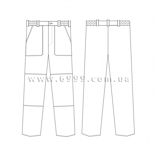 Робочі штани "Профі" мають прямий силует з пришивним поясом та нашитими прямокутними накладними наколінниками. Застібається гульфік на ґудзики. Пояс пришивний, з вставленими, з боків, еластичними стрічками. Дві бокові накладні кишені мають вхід на вкіс.