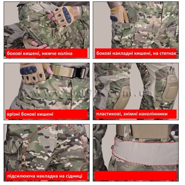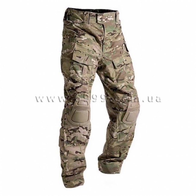 Штани тактичні "Багнет", прямого крою, з розширеним(3 см спереду, та 5 см по спині) пришивним поясом, зі шльовками під широкий ремінь, що застібається на текстильну стрічку. Гульфік на блискавці. 2 кишені врізні, з боків, нижче поясу, 2 кишені накладні, позаду, на стегнах, з клапанами на липучках, 2 кишені накладні спереду на стегнах, з клапанами на текстильних стрічках, 2 кишені позаду, розташовані на литках, на текстильних стрічках, з клапанами. В області колін розташовані кишені під наколінники. У комплекті зі штанами йде 1 пара пластикових наколінників, на підкладці зі спіненого поліуретану. Наколінники виймаються, для зручності при пранні.