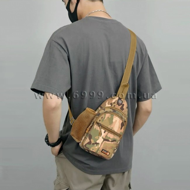 Рюкзак-слінг тактичний має одну, регульовану по довжині, лямку, що одягається або через голову й одне плече або на одне плече. На лямку нашито широку, об'ємну смугу тканини, яка слугує для рівномірного розподілення ваги рюкзака-слінга, на плече. Носиться або спереду на грудях, або за спиною. Має одне велике відділення, одну зовнішню бокову кишеню, під пляшку, одну врізну та одну об'ємну кишені. На об'ємну кишеню нашиті стрічки системи Molle.У верхній частині рюкзака знаходиться місце для кріплення шеврона(нашито текстильну стрічку). В середині рюкзак-слінг має відділення для планшета та відділення для речей. Фурнітура(кільця, рамка та карабіни) виготовлені з ударостійкого пластику. Бігунки блискавок оснащені пулерами.