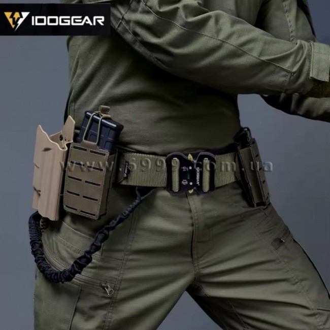 Ремінь тактичний подвійний складається, з двох ременів. Внутрішній ремінь - це тканинна стрічка з нашитою текстильною стрічкою("тато"). Зовнішній ремінь - це також тканинна стрічка з нашитою текстильною стрічкою ("мама"). Зовнішній ремінь прикладається до внутрішнього та має металевий карабін-застібку.
