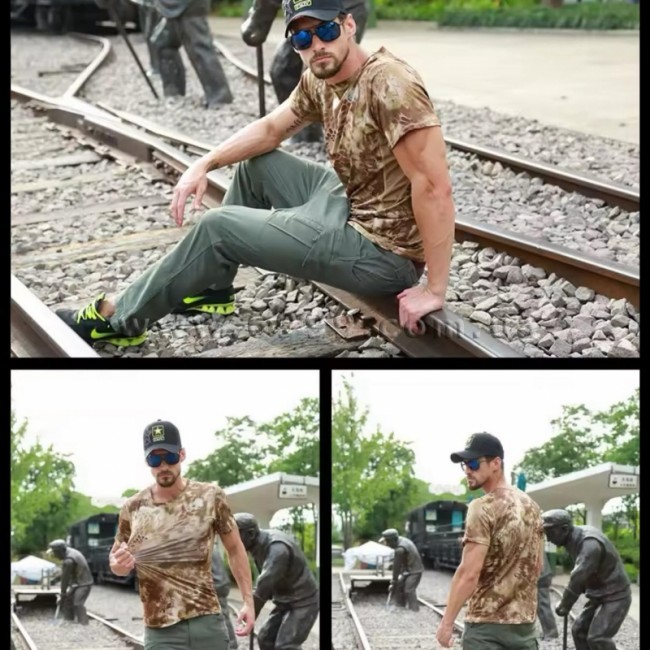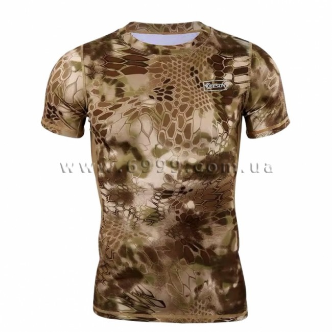 Тактична футболка з коротким рукавом та круглим вирізом горловини, прошита подвійним швом. Низ футболки підвернуто та прошито оверлочною машиною. Нанесення малюнку камуфляжу виконано по технології "3D-print". Забарвлення - яскраве, контрастне та стійке до вицвітання(вплив УФ-променів). Має індивідуальне пакування.