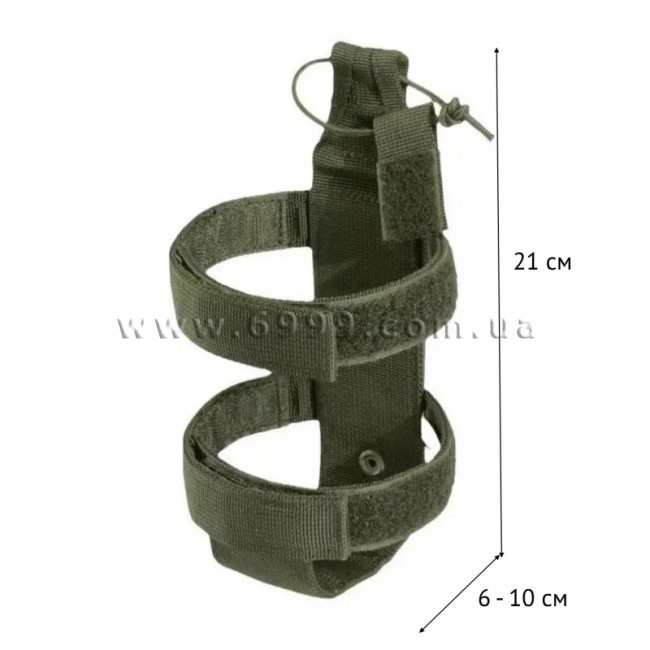 Тримач виготовлено з потовщеної ремінної стрічки та текстильної липучки, яка може утримувати пляшку об'ємом від 0,5 л до 1,5 л. Шийка пляшки фіксується у тримачі еластичним шнуром. Тримач можна чіпляти на ремінь або на систему Молле (до рюкзака, бронежилета, розвантажувального жилета, ремінно-плечової системи то що).