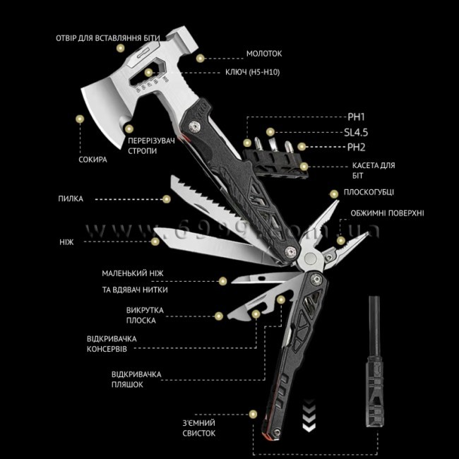 Мультитул-сокира 14:1 - це модель мультитула, в основі якої покладено маленьку сокирку. Двокольорне руків'я виготовлено з текстурного алюмінію, у яке вставляється касета з трьома бітами(PH1, SL4.5, PH2) та свисток. Усі інструменти виготовлені з нержавіючої сталі. У комплекті є напівтвердий поясний чохол, виготовлений з нейлонової тканини.