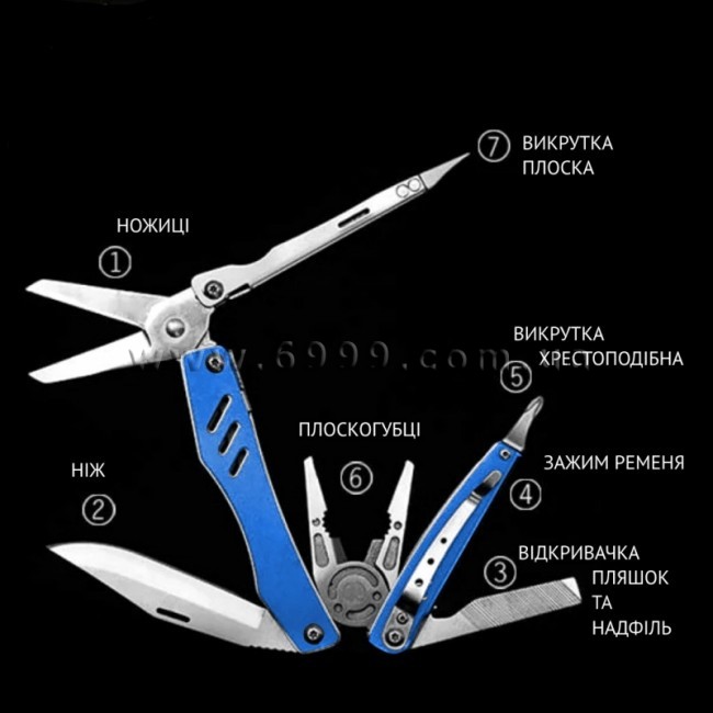 Мультитул 7:1 "5216" - це набір з 7 інструментів виготовлений зі сталі 2Cr13 (інструмент) та алюмінієвого сплаву (руків'я). У комплекті є тканинний чохол чорного кольору, з помаранчевим оздобленням. Мультитул можна носити у чохлі на поясі або без чохла(має спеціальну кліпсу для кріплення на ремінь).