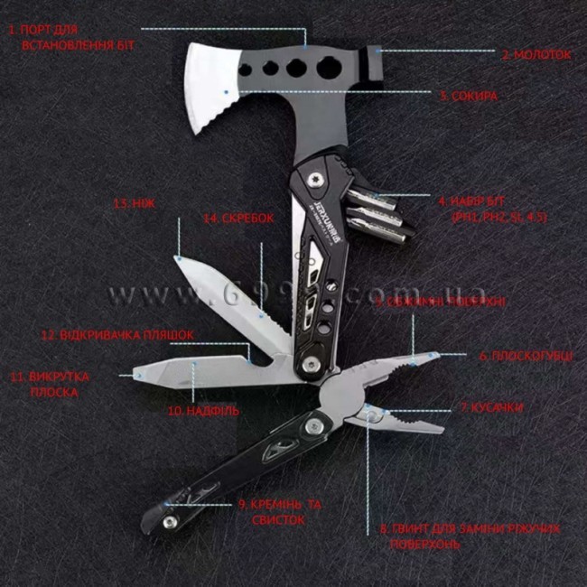 Мультитул-сокира 14:1 "JERXUN" - це мультитул відмінною рисою якого є наявність сокири. У комплект входить тканинний поясний чохол.