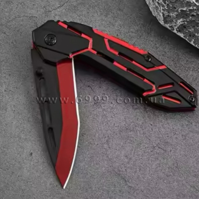 Ніж "Блискавка" - розкладний оригінальний ніж з футуристичним дизайном. Має вигнуту верхню частину руків'я та прорізи по всьому руків'ю, які подекуди заповнені фарбою. Спуск, лезо та підвод, на 1/3 від вістря, мають різкий злам, що разом з чорним кольором усього ножа та вигнутою верхньою частиною руків'я та прорізами розташованими, по всьому руків'ю, що подекуди заповнені синьою( або червоною) фарбою - роблять цю модель дуже оригінальною. Спуск пофарбовано. Руків'я має дві сталеві накладки. На одній розташовано кліпсу, для носіння по поясі або в кишені, а інша більш об'ємна. На лезо, біля руків'я, встановлено шпеньок. Руків'я оснащено стопором леза. У комплекті є поясний чорний чохол, виготовлений з синтетичної водонепроникної тканини "Oxford D600".