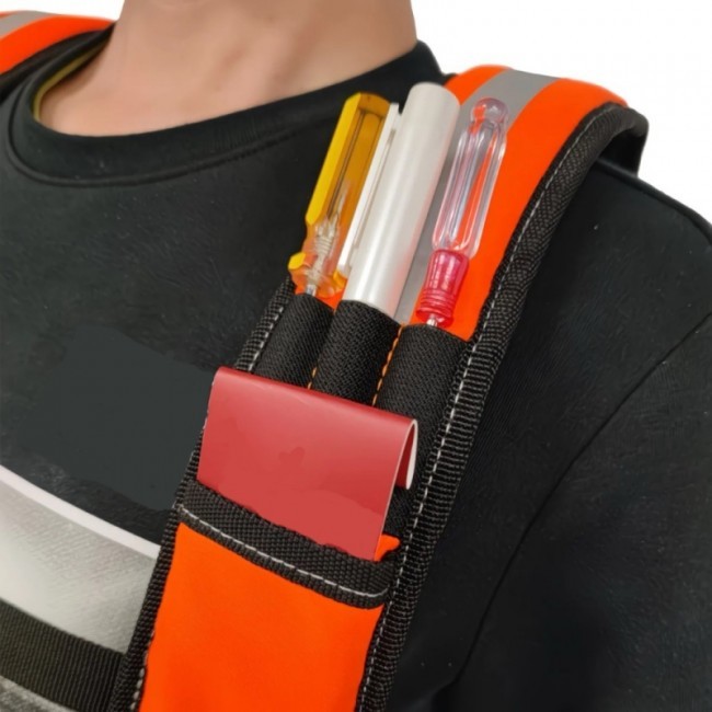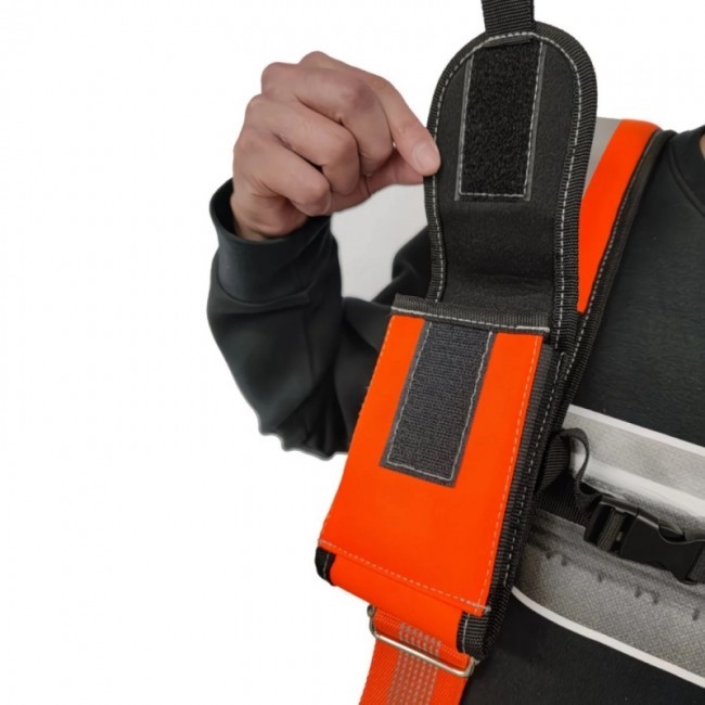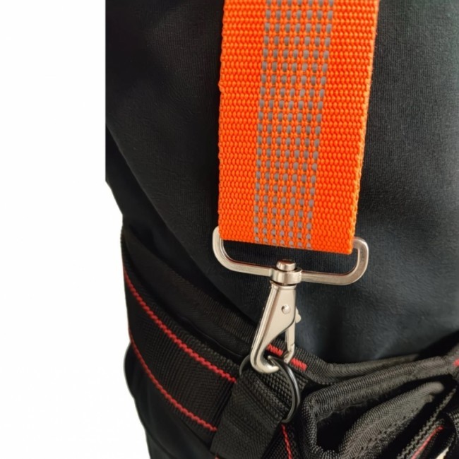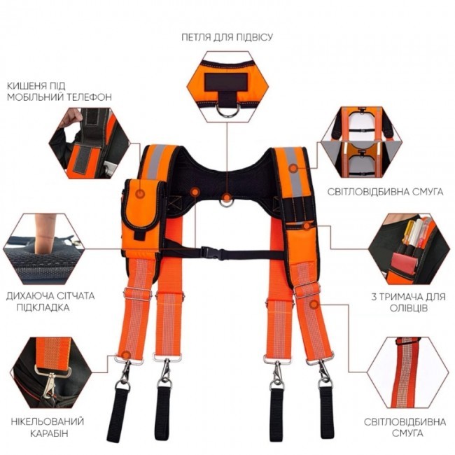 Підтяжки для поясу з інструментом виготовлені з поліпропіленової стрічки шириною 5 см. Мають наплічник виготовлений з синтетичної тканини "Oxford D600" та об'ємної поліамідної сітки, що призначений для розподілу ваги інструменту по усій площині плечей. На передній правій стрічці розташовано кишеню, з клапаном, на липучці, під мобільний телефон або рацію. На передній лівій стрічці розташовано 3 тримачі під олівці. Ліва та права стрічки з'єднані горизонтальною стрічкою з пластиковим карабіном, яка запобігає звалюванню підтяжок з плечей. На кінці кожної стрічки пришито металевий карабін з поліамідним тримачем поясу. На передніх та задніх стрічках розташовано металеві рамки, якими регулюється довжина підтяжок. По середині стрічок та по наплічнику розташована стрічка зі світловідбивною фарбою, що відблискує у темряві. Уся металева фурнітура пройшла антикорозійну обробку. Підтяжки призначені для полегшення носіння поясу, з підсумками, у яких розміщено інструмент, та є зручною працезберігаючою опорою.