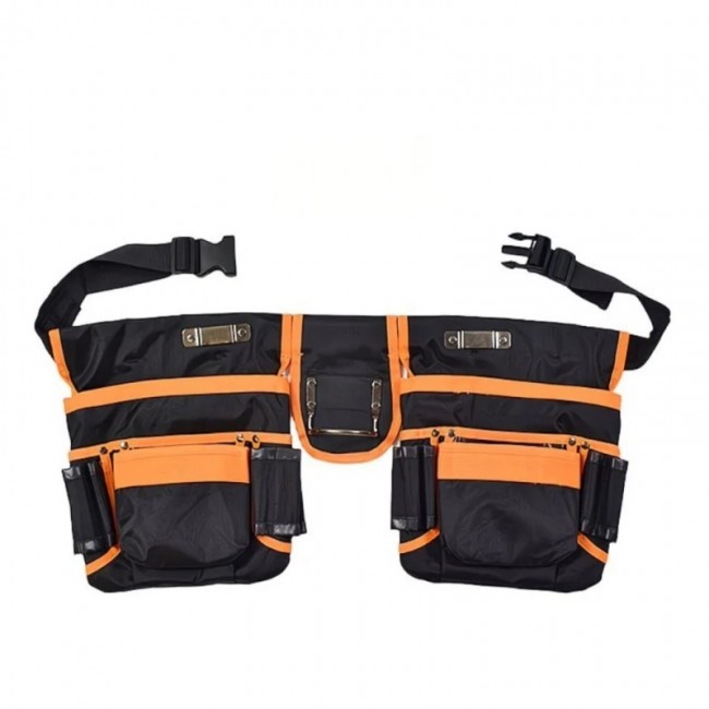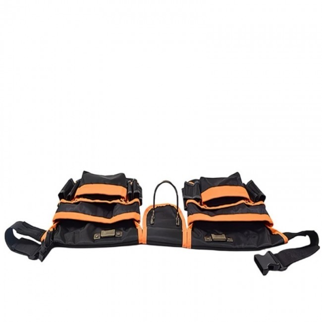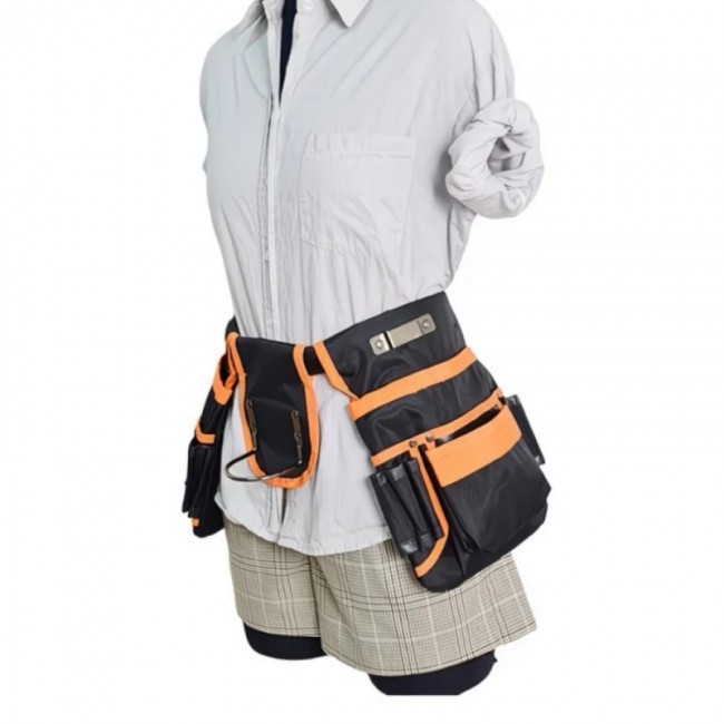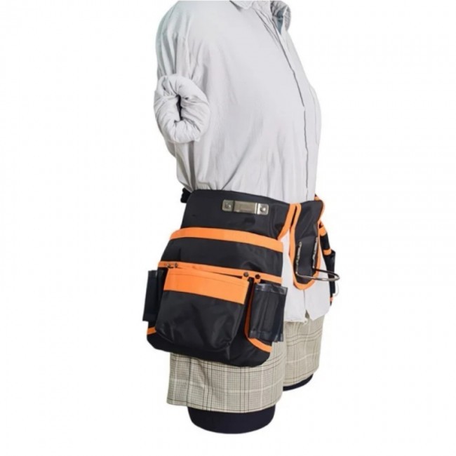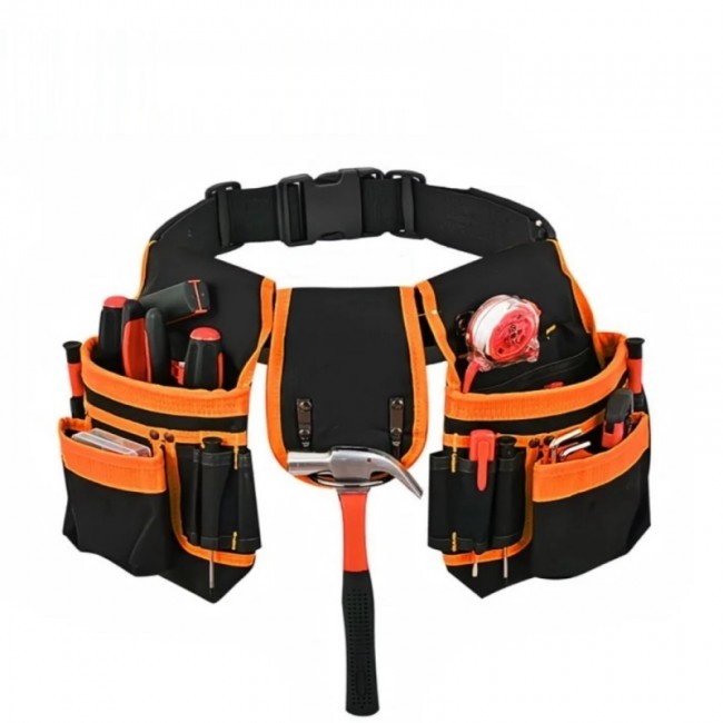 Пояс для інструменту складається з самого поясу, двох однакових підсумків для інструменту та тримача молотка. Монтажний пояс виготовлено з поліамідної стрічки, шириною 5 см, та пластикового карабіна, типу "фастекс", який виконує роль застібки та регулятора довжини поясу(79 - 122 см). Підсумки та тримач молотка виготовлені з синтетичної зносостійкої та водонепроникної тканини "Oxford D600", та мають по одній магнітній зоні, на зовнішній стороні виробу(на фото ці зони видно як прямокутник прострочений кольоровою ниткою). Магнітна зона(металева намагнічена пластина вшита у виріб) - це місце куди можна, під час роботи, чіпляти металічні кріплення(шурупи, гвинти, гайки, шайби, цвяхи). У кожному підсумку розміщується до 12 інструментів(шурупокрут та біти, викрутки, плоскогубці, кусачки, ніж, ключі, свердла тощо). На всьому поясі розміщується до 26 інструментів. Носити пояс монтажника можна як з карабіном попереду, так і з карабіном на попереку.