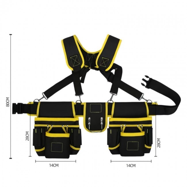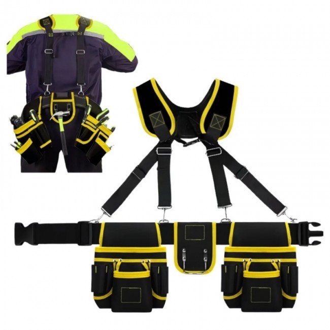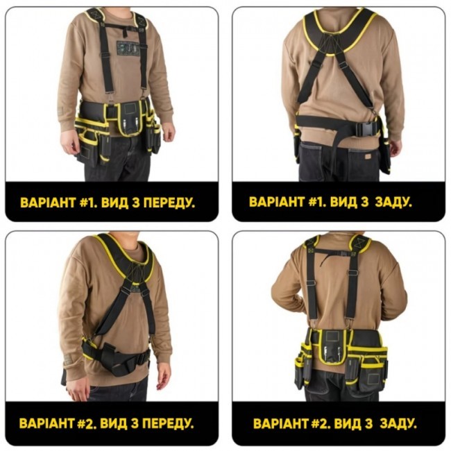 Підтяжки мають наплічник, з чотириточковим кріпленням до стрічок-підтяжок, що призначений для ергономічного розподілу ваги інструменту по усій площині плечей. З переду на лівій стрічці розташовано 3 тримачі під олівці, а на правій стрічці розміщено кишеню, під рацію/мобільний телефон, що прикривається клапаном, на липучці. На грудях обидві передні стрічки з'єднані горизонтальною стрічкою з пластиковим карабіном, яка запобігає звалюванню підтяжок з плечей. Довжина кожної стрічки регулюється металевою рамкою. На кінці кожної стрічки пришито металевий карабін з поліамідним тримачем поясу.