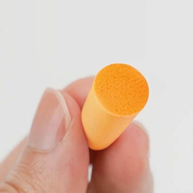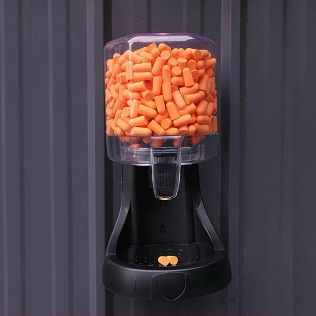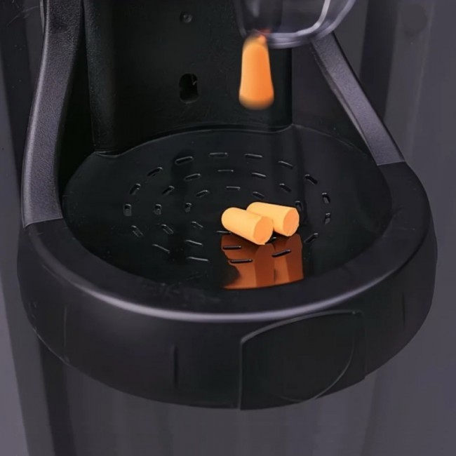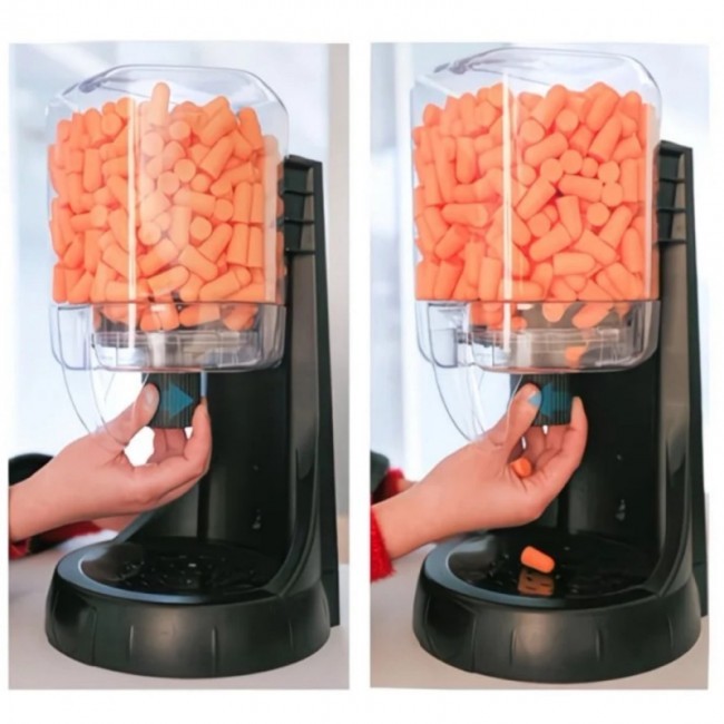 Диспенсер для берушів складається з прозорої колби, дозатора та пластикової основи Призначений для зберігання та дозованої(по 2 шт) видачі берушів при натисканні дозатора. У колбу міститься 500 берушів(присутні у комплекті). Диспенсер можна повісити на стіну або поставити на горизонтальну поверхню. Беруші виготовлені зі спіненого поліуретану що має пам'ять, та після деформації повертається у вихідне положення від 60 до 200 секунд.