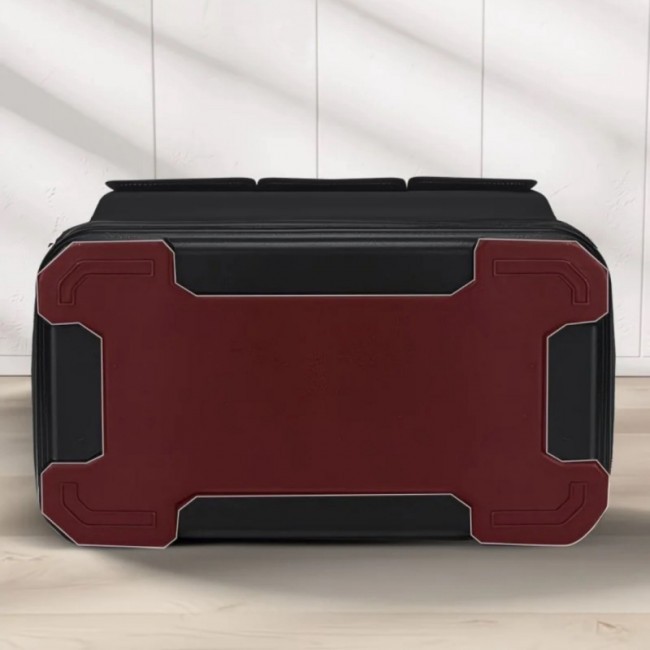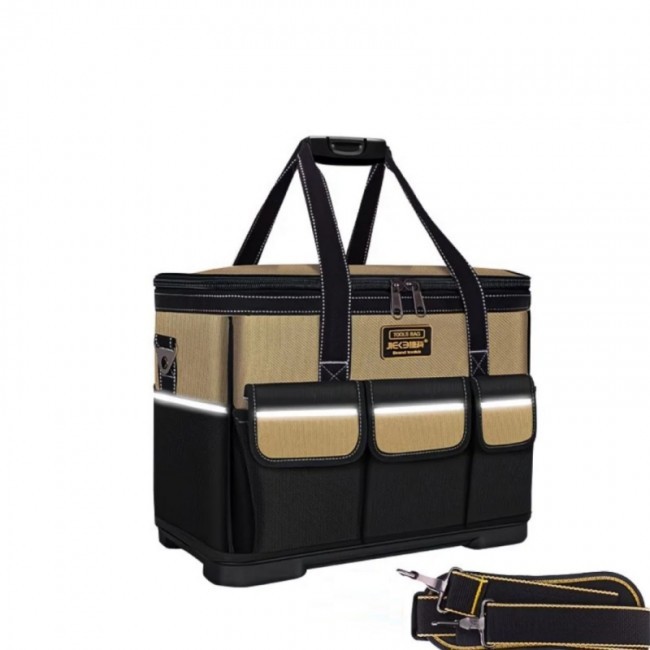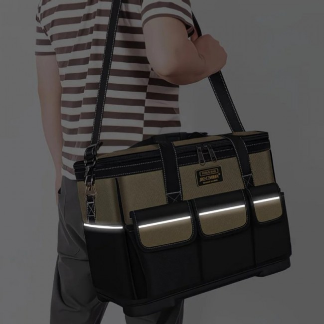 Сумка "61135" для інструменту має відкидну кришку, що зачиняється блискавкою, має одне велике відділення, 8 внутрішніх кишень, 5 зовнішніх кишень та 3 зовнішні кишені з клапаном. На боках сумки, по периметру, нашито світло відбивну стрічку. Дно сумки виготовлено у вигляді пластикового корита, до якого пришито верхню частину сумки. Сумку можна носити на плечі(плечовий ремінь з двома карабінами та регульованою рамкою додається) або у руці. Ручки сумки з'єднуються пластиковим тримачем, з фіксаційною кнопкою.Сумка виготовлена у комбінації чорного та червоного кольорів.