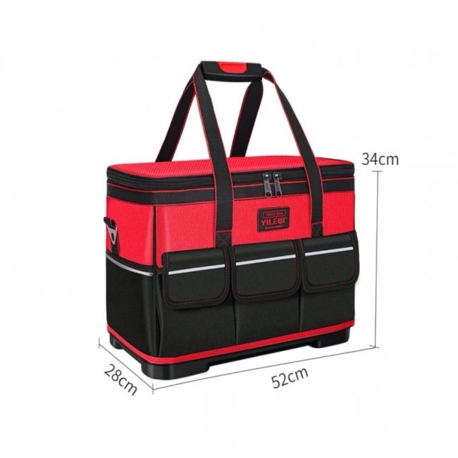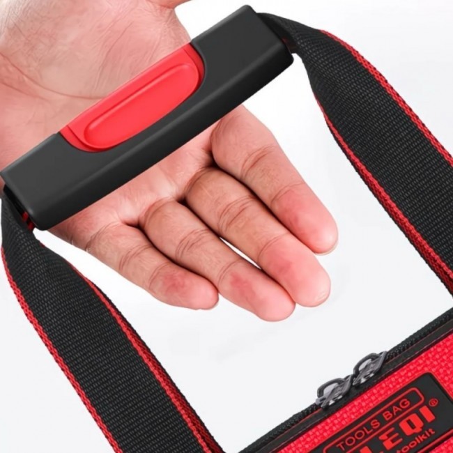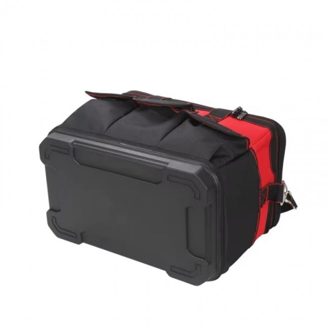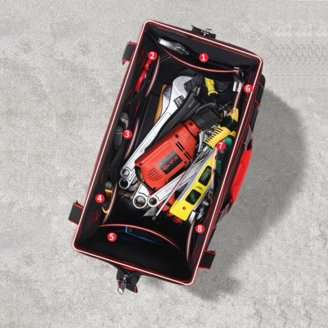 Сумка "61136" для інструменту має відкидну кришку, що зачиняється блискавкою, має одне велике відділення, 8 внутрішніх кишень, 5 зовнішніх кишень та 3 зовнішні кишені з клапаном. На боках сумки, по периметру, нашито світло відбивну стрічку. Дно сумки виготовлено у вигляді пластикового корита, до якого пришито верхню частину сумки. Сумку можна носити на плечі(плечовий ремінь з двома карабінами та регульованою рамкою додається) або у руці. Ручки сумки з'єднуються пластиковим тримачем, з фіксаційною кнопкою.Сумка виготовлена у комбінації чорного та червоного кольорів.