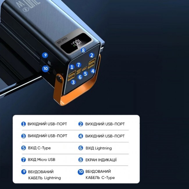 Повербанк "61155" - це портативний акумулятор, з двома вбудованими шнурами(C-Type та Lightning), призначений для одночасного заряджання 6 гаджетів. Має ліхтар, екран індикації заряду та ручку для зручної переноски. У корпусі розташовані: 4 USB-порти, 1 порт C-Type, 1 порт Lightning та 1 Micro-USB. Вихідна потужність 240W дозволяє заряджати гаджет, до 80% за 30 хвилин.