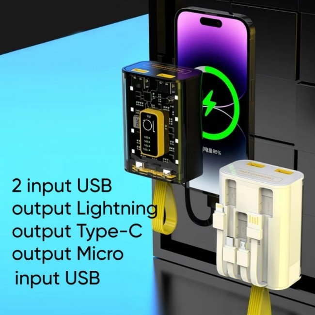 Повербанк-міні "Мікросхема-10" - дизайн корпуса імітує відкриту електронну плату з мікросхемами. Має два вихідні USB-порти, один вбудований шнур, для підзарядки, з USB-роз'ємом та три шнури з вихідними роз'ємами(Micro, C-Type та Lightning). Призначений для одночасного заряджання 5 гаджетів. Має надшвидку зарядку(PD22.5W) повербанка та багаторівневий захист. За 30 хвилин заряджає 60% до ємності акумулятора. На торцевій частині розташована пластикова петля для переноски powerbank.