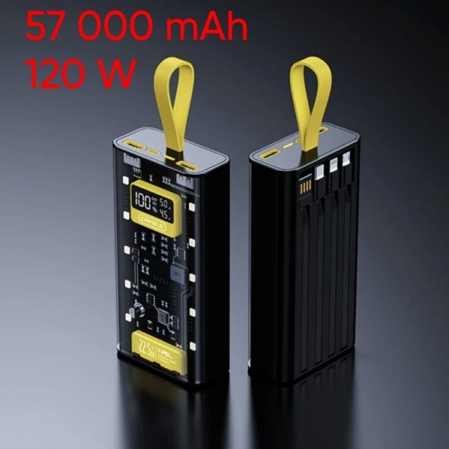 Повербанк "Мікросхема-57" - дизайн корпуса імітує відкриту електронну плату з мікросхемами. Має два вихідні USB-порти, один вбудований шнур, для підзарядки, з USB-роз'ємом та три шнури з вихідними роз'ємами(Micro, C-Type та Lightning), Призначений для одночасного заряджання 5 гаджетів. Має надшвидку зарядку(PD22.5W) повербанка та багаторівневий захист. За 30 хвилин заряджає 60% до ємності акумулятора. На торцевій частині розташована пластикова петля для переноски powerbank.