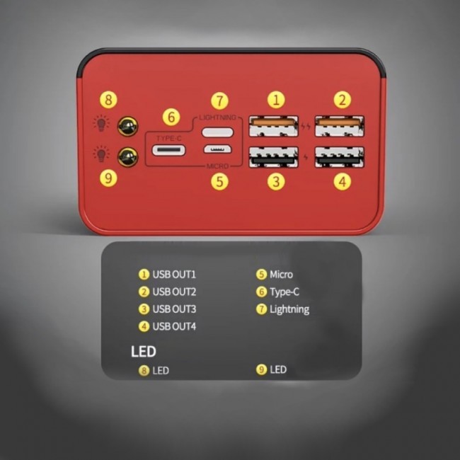 Повербанк "Red Meteorite-50" - це компактний акумулятор, що має два LED-ліхтаря, дисплей індикації заряду, 4 вхідних USB-порти та 3 вихідних порти(Micro, C-Type та Lightning), Призначений для одночасного заряджання 6 гаджетів. Вихідна потужність 480W дозволяє заряджати гаджет, до 88% за 30 хвилин. Має багаторівневий захист, а саме від: підвищеної та пониженої вхідної/вихідної напруги, перегріву, короткого замикання, перезарядження, електростатичного та електромагнітного полів.Тримає заряд, від початкового, без втрати: до 7 днів.