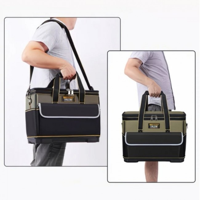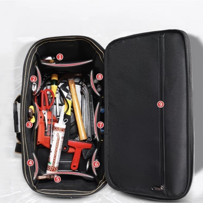 Сумка "61191" має відкидну кришку, що зачиняється блискавкою, має одне велике відділення, 8 внутрішніх відкритих кишень, 1 кишеню у нижній частині кришки, що зачиняється на блискавку, та 1 велику зовнішню кишеню з клапаном, що обшитий світловідбивною стрічкою. Дно сумки виготовлено у вигляді ударостійкого пластикового корита, на ніжках, до якого пришито верхню частину сумки. Сумку можна носити на плечі(плечовий ремінь з двома карабінами та регулювальною рамкою додається) або у руці(ручки сумки з'єднуються пластиковим тримачем, з фіксаційною кнопкою). Уся фурнітура та блискавки виготовлені з металу, окрім регулювальної рамки. Сумка виконана у комбінації чорного та хакі кольорів. Сумка призначена для перенесення інструменту.