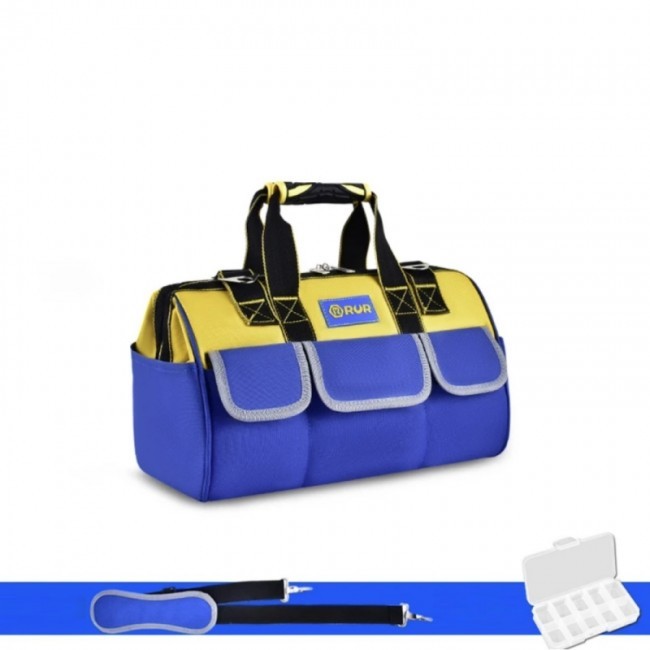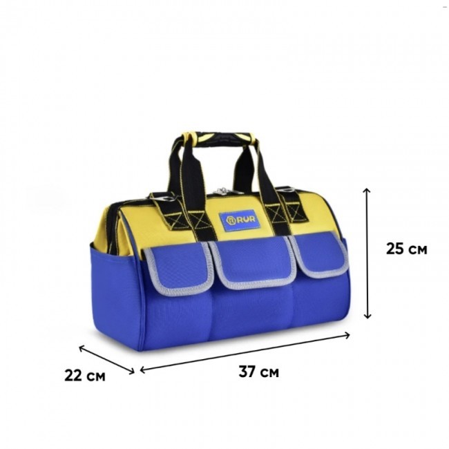 Сумка "61205" для інструменту, типу "саквояж", виготовлена з водонепроникної синтетичної тканини "Oxford 860D" та зачиняється на металеву блискавку, що має два бігунки які закриваються від країв до центру. Наявність великого центрального відділення та 8 зовнішніх кишень(6 мають клапани на липучках, 2 відкриті кишені) дозволяє раціонально розміщувати інструмент. Дві ручки, виготовлені з синтетичної ремінної стрічки, та мають гумові накладки, під долоні, для зручності утримання. Ручки пришиті по периметру, хрест на в хрест, та прикріплені заклепкою(на кожному кінці). На сумці, за допомогою ремінної стрічки, прикріплено два металевих трикутники, з отворами, за які чіпляються карабіни плечового ременя. Місце кріплення ремінної стрічки до тканини верха сумки прошито по периметру, хрест навхрест, та прикріплені заклепкою(на кожному кінці). Тому сумку можна носити у руці, або через плече, на ремінній стрічці, яка має два металевих карабіни та демпферну накладку. На цій стрічці розташовано металеву рамку, яка регулює довжину стрічки. Сумка виготовлена у комбінації жовтого та блакитного кольорів та має яскраві жовті лінії по краю ремінної стрічки, що вишиті жовтими нитками. Ефектно виглядає жовта окантовка зовнішніх кишень. Комплектується пластиковою коробкою для кріплень. Сумка призначена для зберігання та перенесення інструментів.
