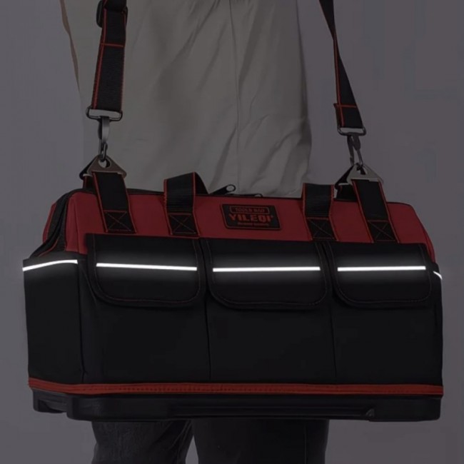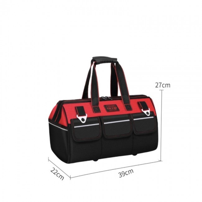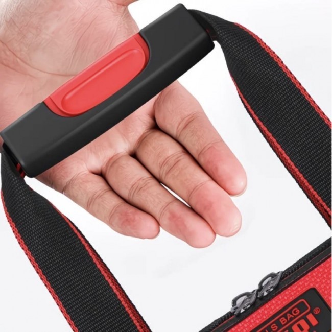 Сумка "61206" для інструменту - це модель типу "саквояж", на блискавці, з двома бігунками, яку можна носити на плечовому ремені або у руці. На плечовому ремені вдягнута демпферна накладка на плече, два карабіни по краях та металева рамка, що регулює довжину ременя. Має одне центральне внутрішнє відділення та три зовнішніх кишені, що прикриті клапанами на липучках. Ручки сумки виготовлені з широкої поліамідної стрічки, що мають гумові підкладки на долоні. По периметру сумки вшито світловідбивний кант, що світиться у темряві. Дно сумки - напівжорстке та обтягнуто тканиною. Сумка виготовлена з водонепроникної синтетичної тканини "Oxford 600D". Нижня частина сумки чорного кольору, а верхня червоного.