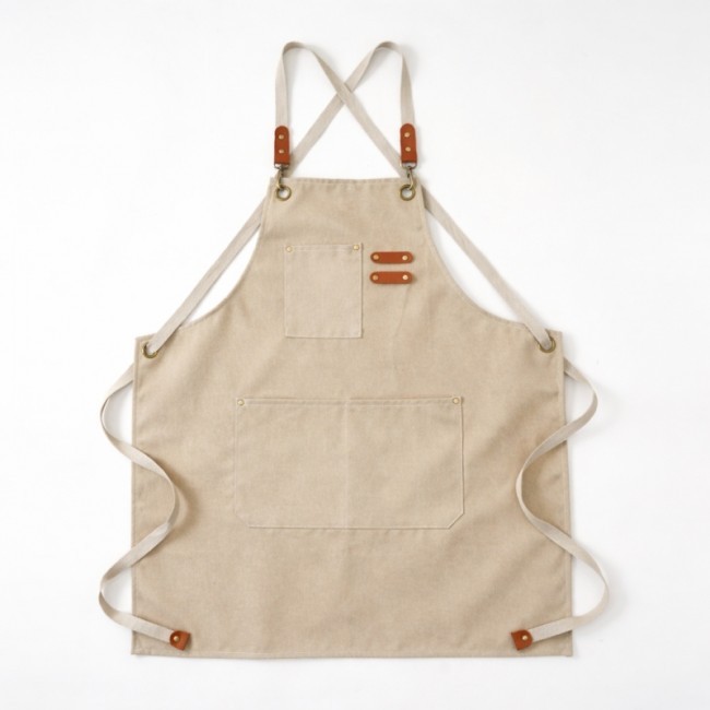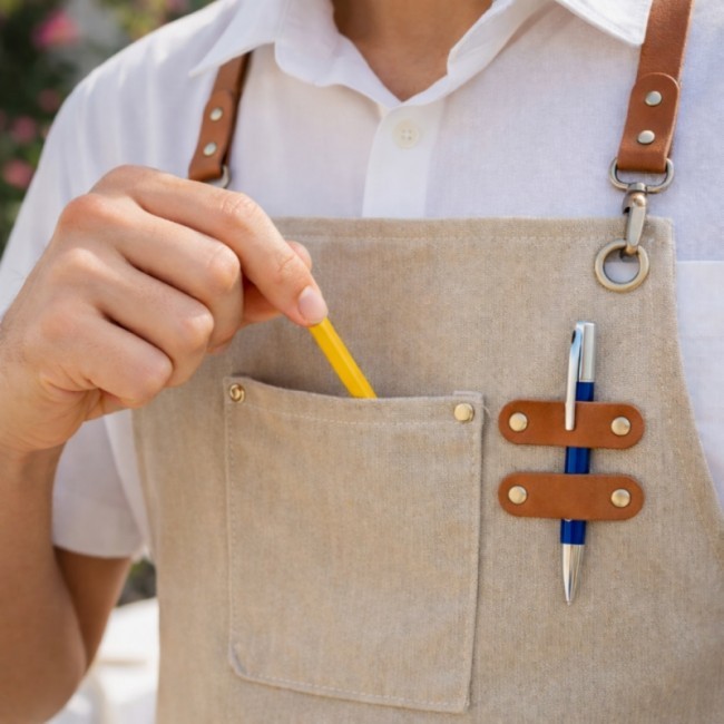 Фартух "Фуд-сервіс" - модель "унісекс". На нагруднику нашита накладна кишеня, зліва від якої пришито дві шкіряні стрічки, на які чіпляються олівці та ручки. На животі розташовано ще дві накладні кишені. Фартух тримається на тканинних бретелях, що кріпляться карабінами до нагрудника, проходять через металеві люрекси та зав`язуються на поясі. Кінцівки бретель мають шкіряні наконечники. Люрекси та карабіни мають протикорозійну обробку.