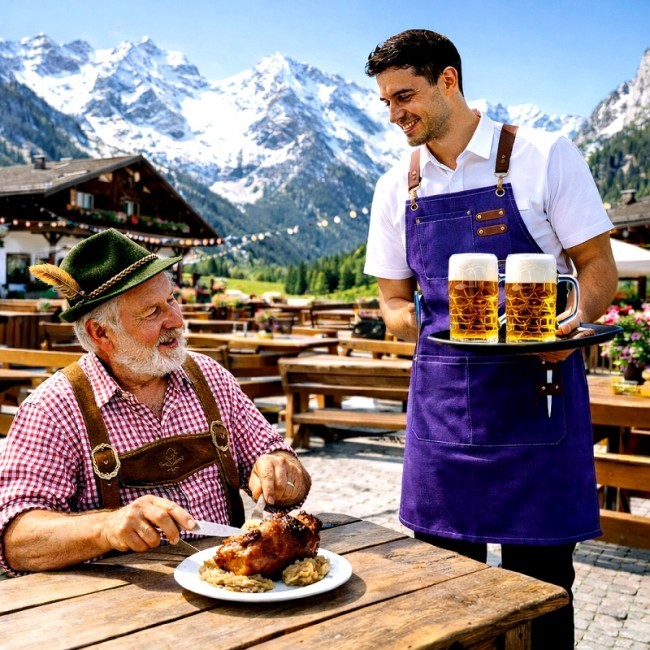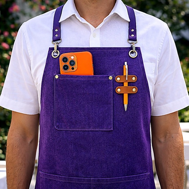 Фартух "Фуд-сервіс" - модель "унісекс". На нагруднику нашита накладна кишеня, зліва від якої пришито дві шкіряні стрічки, на які чіпляються олівці та ручки. На животі розташовано ще дві накладні кишені. Фартух тримається на тканинних бретелях, що кріпляться карабінами до нагрудника, проходять через металеві люрекси та зав`язуються на поясі. Кінцівки бретель мають шкіряні наконечники. Люрекси та карабіни мають протикорозійну обробку.