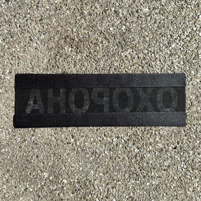 Нашивка "ОХОРОНА", з липучкою, це знімний шеврон що чіпляється на спину. Виготовлений методом машинної вишивки. Білою ниткою на чорному тлі вишито ОХОРОНА та по краю об'оверлочено чорною ниткою.