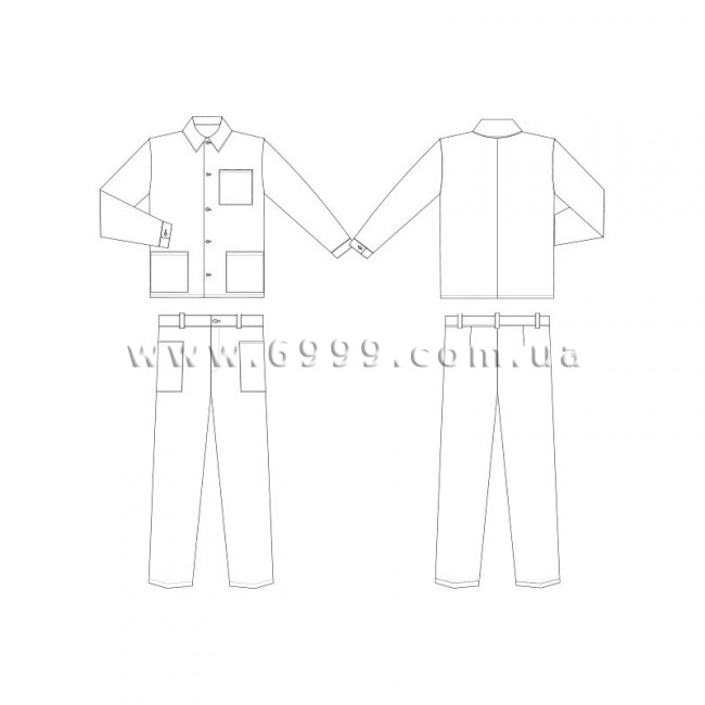 Костюм робочий (куртка+штани) виготовлений з бавовняної тканини "Діагональ". Куртка пряма, подовжена, з відкладним коміром, з застібками на ґудзиках. На лівій поличці пришита накладна прямокутна кишеня. Пришивний рукав з пришивною манжетою на ґудзику. Обидві нижні кишені накладні чотирикутні.