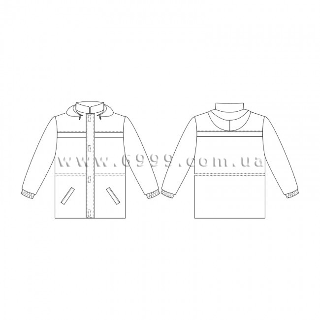 Куртка "Контакт" - класична модель робочої утепленої куртки, з прямим, подовженим(нижче пояса, до верхньої частини стегна) силуетом, з відстібним капюшоном, на ґудзиках. Капюшон має розташовану по краю кулісу, що регулює щільність прилягання капюшона, до голови. Застібається куртка на роз'ємну блискавку, яка прикрита вітрозахисною планкою. Комір відкладний. Рукав пришивний з манжетою на еластичній стрічці. Полиця та спинка мають кокетку. Нижні врізні кишені зі входом на вкіс виготовлені з флісу. Для зручності, по лінії талії розташована внутрішня куліса, зі шнуром та двома фіксаторами. У середині куртки, зліва, розташована накладна прямокутна кишеня.