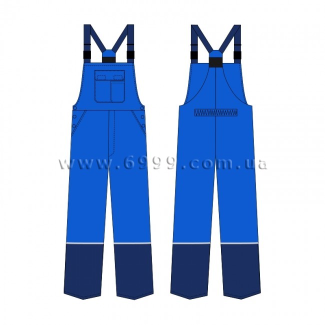 Напівкомбінезон "Модуль" - це робочі штани з нагрудником з'єднані двома шлейками. На нагруднику є накладна прямокутна кишеня, з клапаном на липучці та маленькою кишенею, для олівця, розташовану у лівому кутку нагрудної кишені. Довжину шлейок напівкомбінезона можна регулювати пластиковими рамками, розташованими на шлейках. З боків, по поясу, напівкомбінезон застібається на ґудзики. Бічні кишені врізні накладні, з входом на вкіс. Гульфік застібається на блискавку. Виготовлено у двох кольорах. Штанини відрізні нижче колін оздоблювального кольору, а у шов вставлений світловідбивний кант. Усі інші деталі - основного кольору.