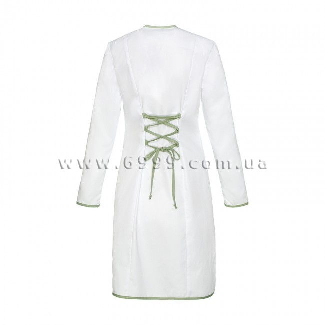 Халат "Аврора" (жіночий) застібається на ґудзики, силует напівприлягаючий. Горловина з V-образним вирізом. Полочки та спинка з рельєфами. Спинка додатково приталюється шнуром по типу "корсет". Рукава довгі. Кишені накладні. Горловина, рукава, кишені, борти та шнур виконані з контрастної тканини.